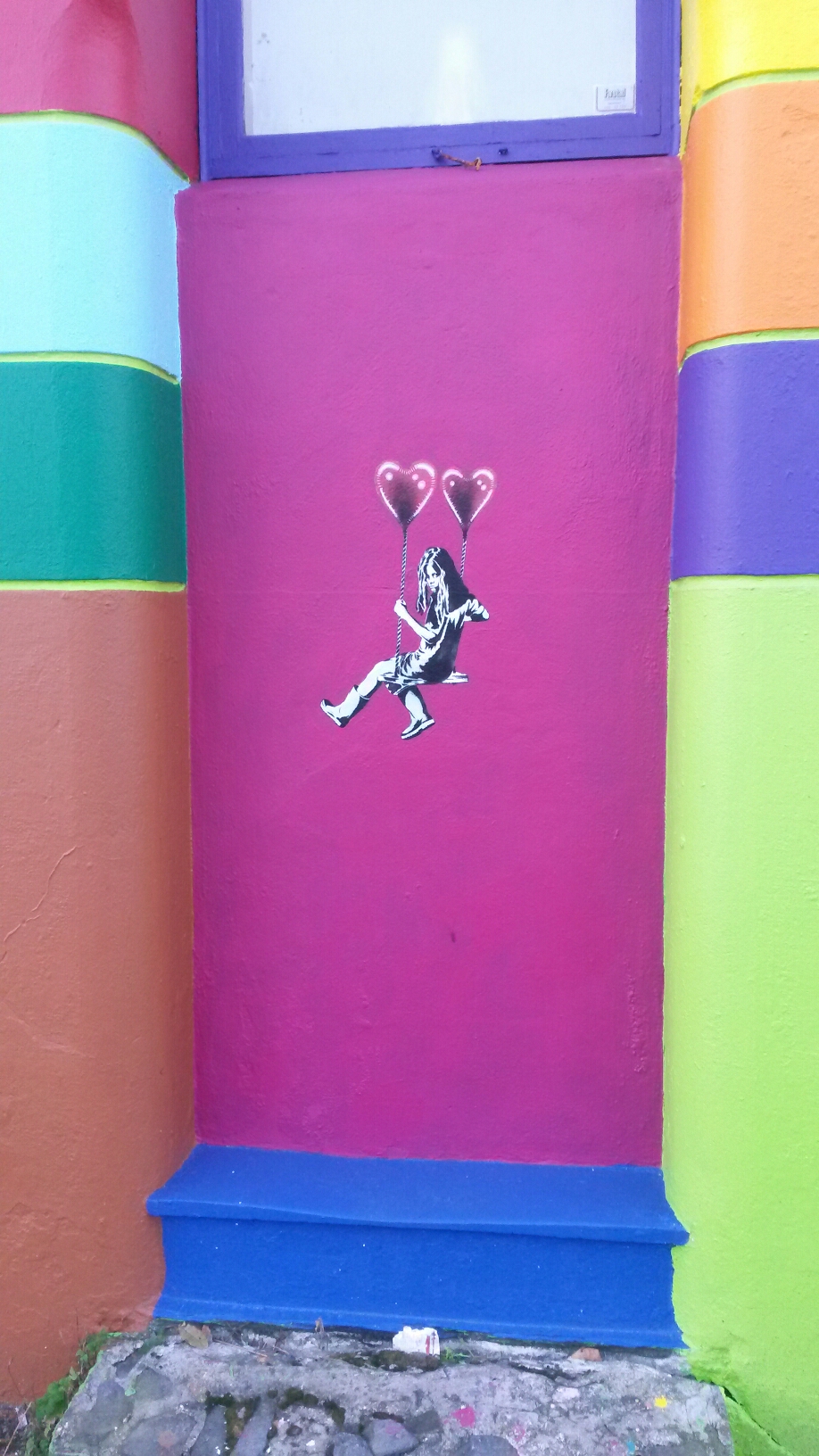 This lovely little piece of art is at a building that holds an art hall that is painted in many bright colours like those in the photo.