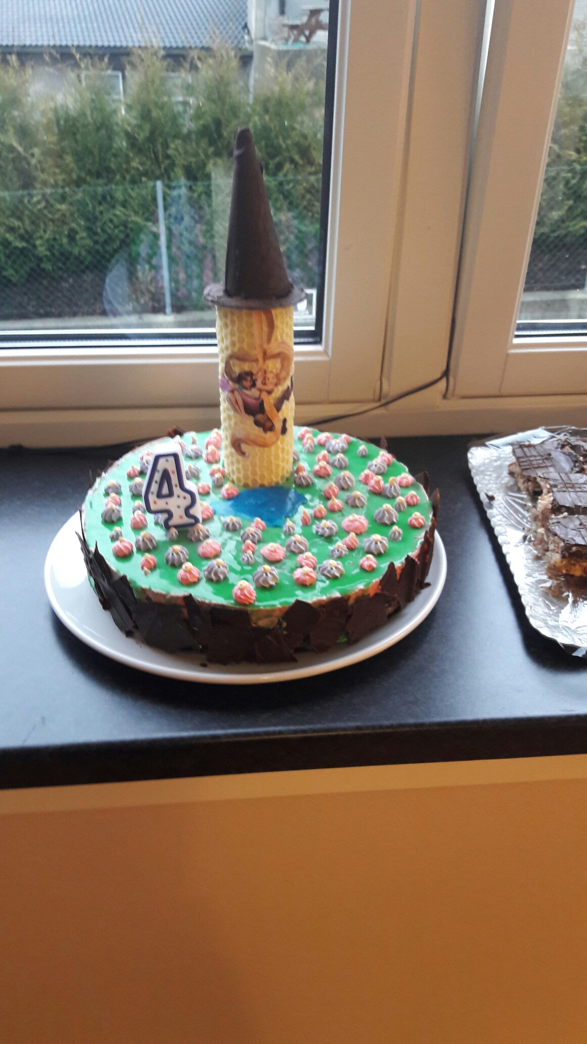 1. It was a 4 year old girls birthday party. She wanted a cake with Rapunzel in her tower. So her Mother made her one. It was very tasty. Chocolate cake with rasberry mousse.