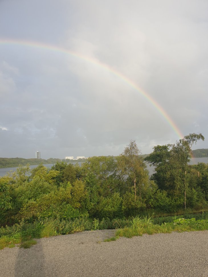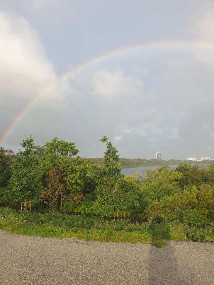 I did not manage to get the full rainbow in one shot, so I did two. As I was late for work I did not have time to search for the pot of gold.