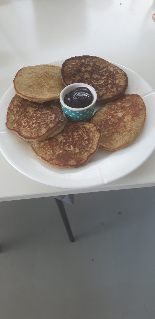 Normally I eat lunch at my work and don’t need a big dinner when I get home. Now I have to make all the meals myself and as we are advised to not go to the shop to often, I have tried making a few different things. Today I had a few bananas that were about to turn brown, so I decided to make a few banana pancakes. I put in bananas, oatmeal, egg, a drop of honey and a splash of milk. They turned out quite nice if I must say so myself.
