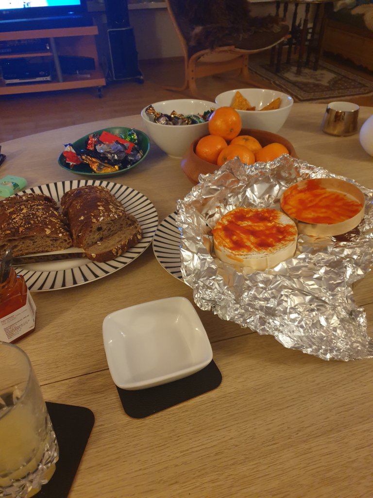 After the walk it was time to do some of the chores that always need doing around the house. But I did just the minimum becuase I wanted to spend the day doing other things. And then I finished the last episodes of “Bridgerton”, a series I have enjoyed quite a lot. In the evening we went to the only person that we can visit at the moment, my mother, to eat some tacos and enjoy the lovely cocktails we had gotten the mixes from the day before. We ate and enjoyed the evening and as my other half’s job had kindly sent him some camenbert, bread and chilli marmelade that we put in the fire-place and ate. I had never tried to put cheese in the fireplace before, but I don’t think it will be te last time.