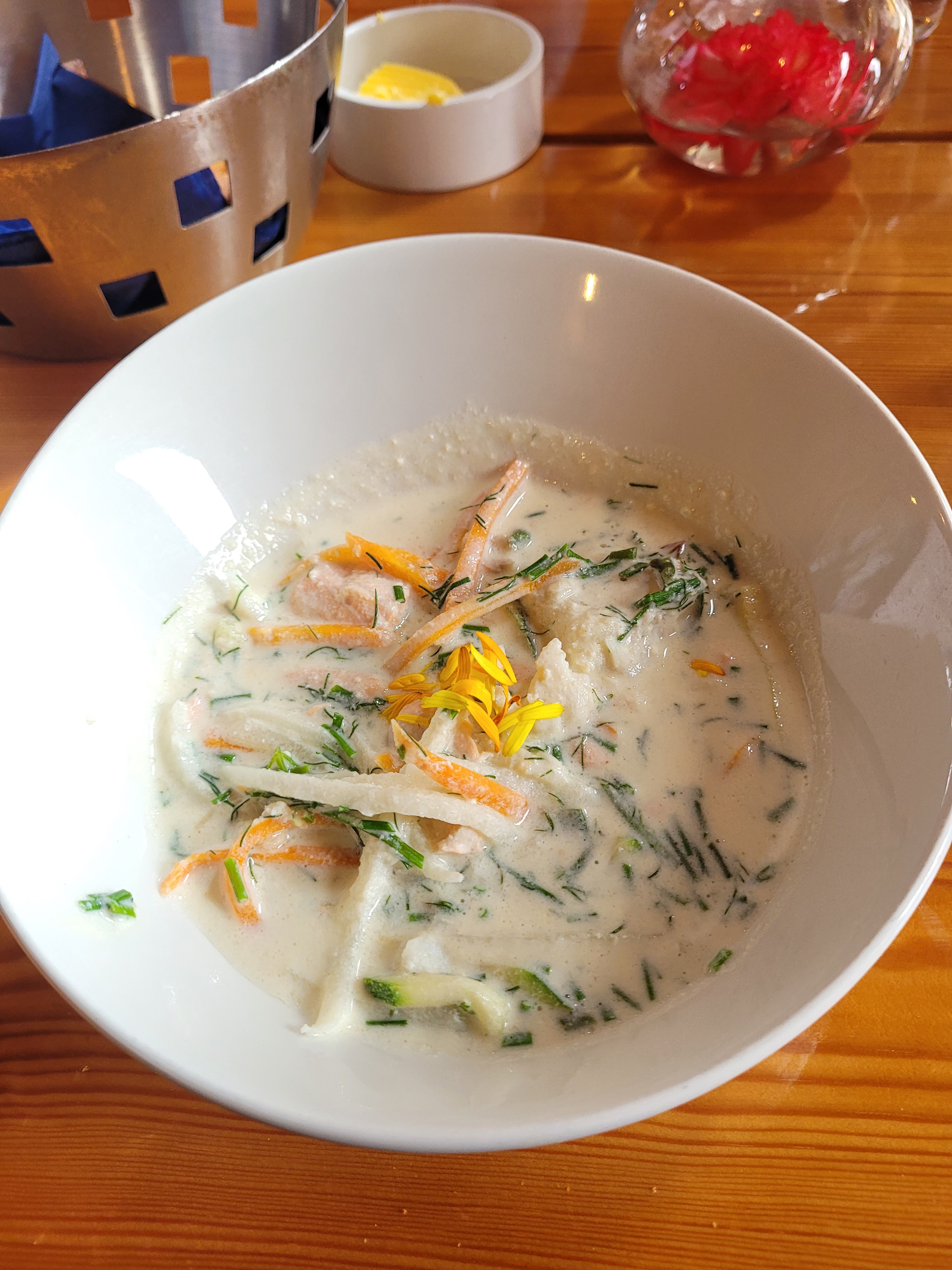 The meal started off with an amazing fish soup with four different types of fish. It was served with a lovely glass of white wine.